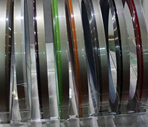 PVC封边条:主要成分为聚氯乙烯,经混炼、压延、真空吸塑等工艺而成的。产品普遍应用于家具、办公、厨具、教学设备、民用实验室等。厚度从0.3至3mm,宽度从12mm至80mm。产品有以下主要特点:表面平滑、无起泡、无拉纹、光泽度适中、表面和背面平整、厚度均匀、宽度一致、硬度合理、弹性高、质量好、耐磨性强、修边后封边侧面颜色与表面颜色接近、不发白、光泽度好、家具成品整体色协调。
